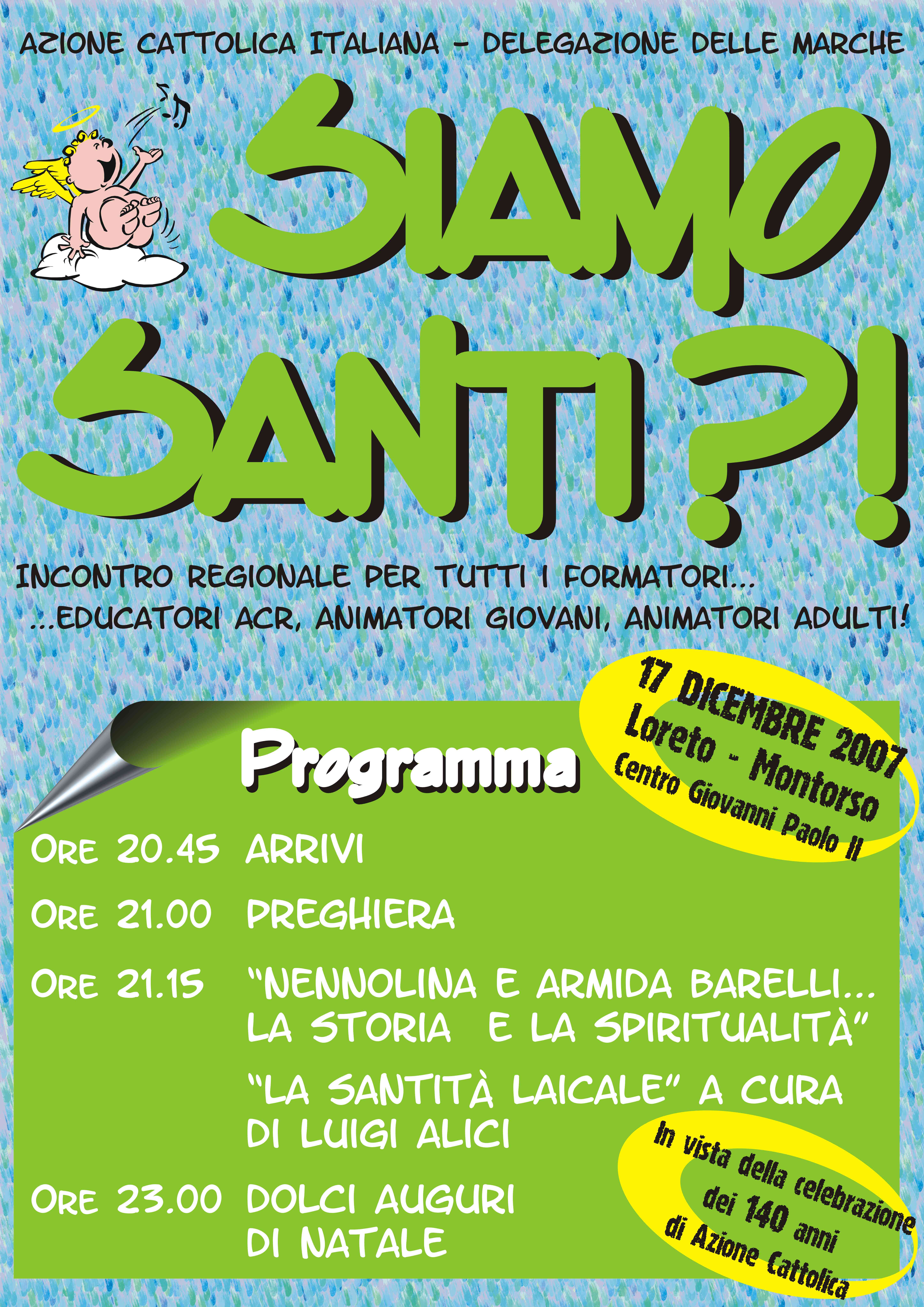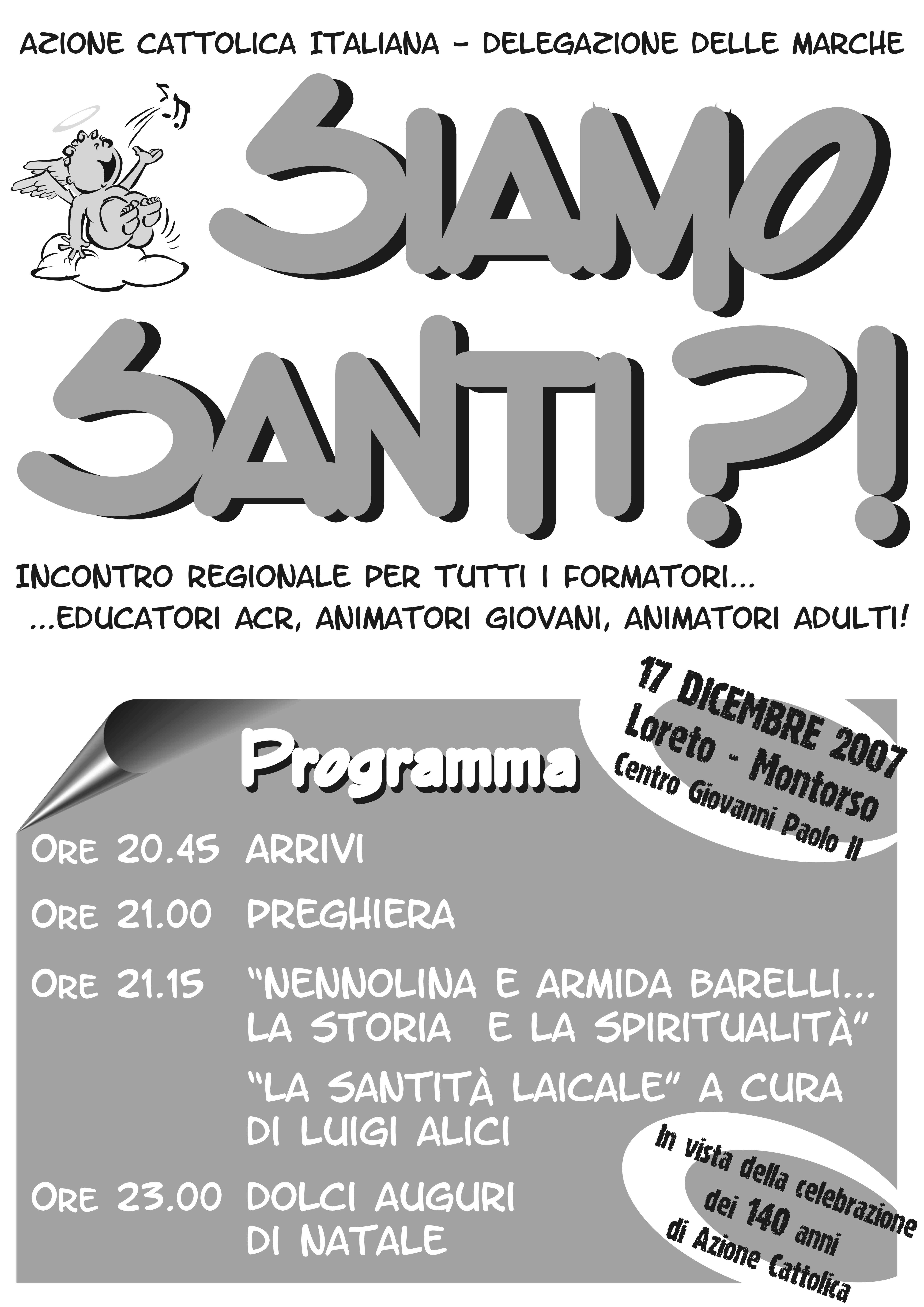 Incontro sulla santità laicale: i materiali[..] Raccogliamo qui i materiali dell'incontro regionale sulla santità laicale tenutosi a Montorso lo scorso 17 dicembre 2007, con la partecipazione del Presidente nazionale Luigi Alici. L'appuntamento, promosso nell'anniversario dei 140 anni dell'as [..]